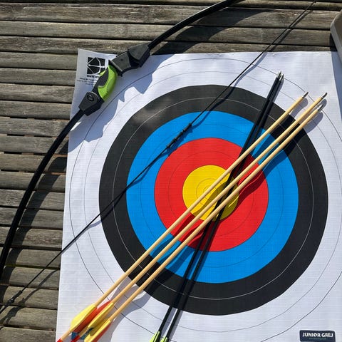 Buer med streng i sort farve. Buerne fremstår som lange, lige buer med greb på midten og medfølgende buestreng. Kan sendes