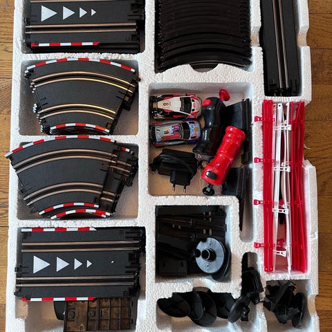 SCX Pole Position racerbane sæt med biler. Sættet indeholder elektrisk racerbane med flere kurver og lige strækninger samt tilbehør som styreenheder og strømforsyning. Der medfølger mindst to racerbiler i forskellige farver, herunder en grøn og en sølvfarvet model. Sættet er egnet som legetøj til indendørs brug og kan samles i forskellige banelayouts, som vist på æskens bagside. Mangler “stolper til bro” biler virker fint