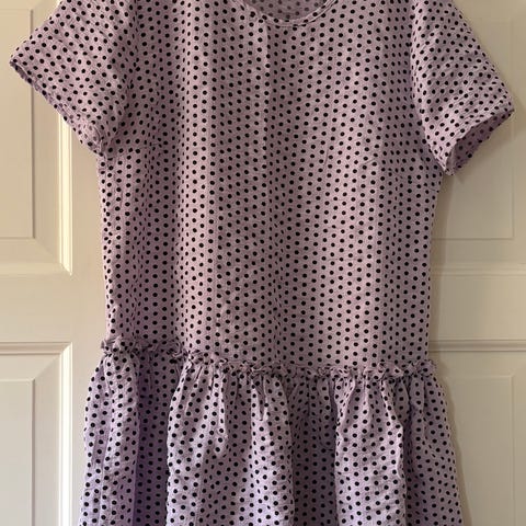 Lollys Laundry hverdagskjole i størrelse S. Kjolen er blå med mønster og fremstillet i bomuld. Modellen har rund hals, knaplukning foroven og lange ærmer. Skørtet er let vidt med skæringer, som giver et afslappet fald. Velegnet som hverdagskjole til kvinder