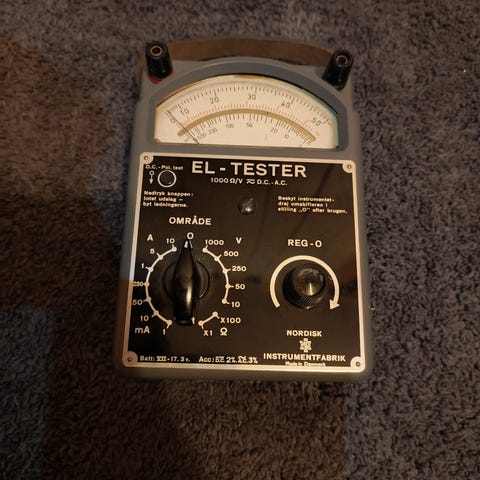 Evershed & Vignoles Ltd analogt måleinstrument, OHM meter i kompakt træhus. Instrumentet har indbygget viserinstrument med skala i et vindue øverst samt metalplader med producentoplysninger på toppen. Kabinettet er udført i træ med samlinger i hjørnerne og metalbeslag, lås og bærekrog på siden. På siden findes desuden en rund stikforbindelse til tilslutning af udstyr eller ledninger. Velegnet som teknisk måleinstrument til elektriske målinger eller som teknisk/industrielt samlerobjekt og dekoration. H 16 cm. B 11 cm. D 16 cm.