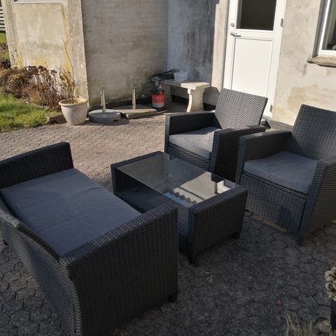 Udendørs loungesæt bestående af en sofa med grå hynder og et lavt firkantet bord. Sofaen har plads til to personer og er velegnet til terrasse eller altan. Bordet har plade med tre brædder og lav højde, egnet som sofabord til udendørs brug. Hynderne trænger til en våd klud og der er en enkelte klat tyggegummi som skal fjernes. Sælges samlet