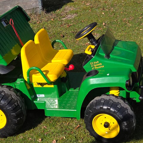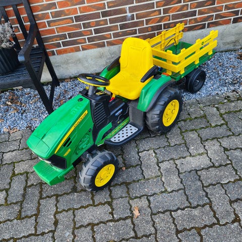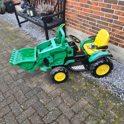 John Deere Gator elektrisk legetraktor med lad i grøn og gul plast. Modellen har to sæder, ratstyring og store plastikhjul, der er egnede til kørsel på græs og fast underlag. Foran er der plastforrude og instrumentpanel med enkle betjeningsknapper. Bagpå er der et åbent lad i hård plast til transport af legetøj eller andre lette ting. Køretøjet er beregnet som elektrisk køretøj til børn og har plads til to børn ad gangen, afhængigt af vægtgrænse fra producenten. Velegnet til udendørs brug i have, indkørsel eller lignende områder, hvor der er jævnt underlag. Den sælges uden batteri. Man kan købe et nyt batteri og sætte i, men den kører langsomt. Dækkene er slidte men virker. Prisen er sat derefter. Den skal hentes i Herfølge.