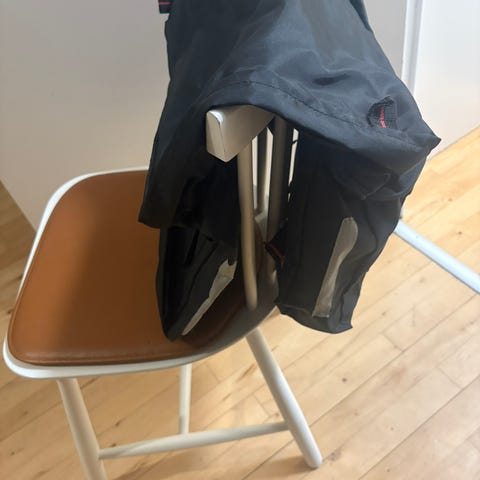 Én taske ligger oven på bagagebæreren og de to sidetasker hænger ned langs siden af baghjulet. De tre dele kan lynes sammen.
