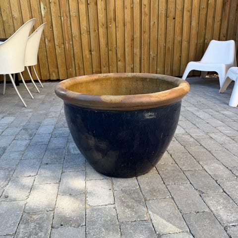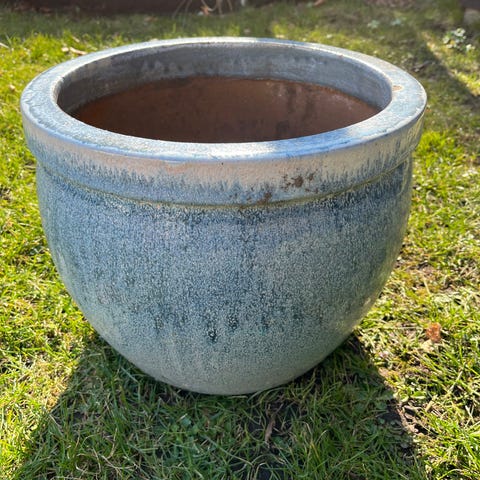 Blå glaseret krukke i keramik til udendørs eller indendørs brug. Krukken har rund form med bred kant og drænhul i bunden, egnet til beplantning af blomster, buske eller mindre træer. Indersiden er uglaseret terrakottafarvet, ydersiden er kraftigt blåglaseret.