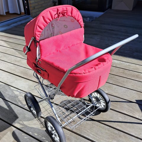 BRIO dukkevogn i lilla stof - er kun brugt indendørs