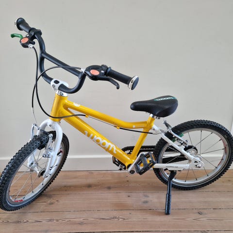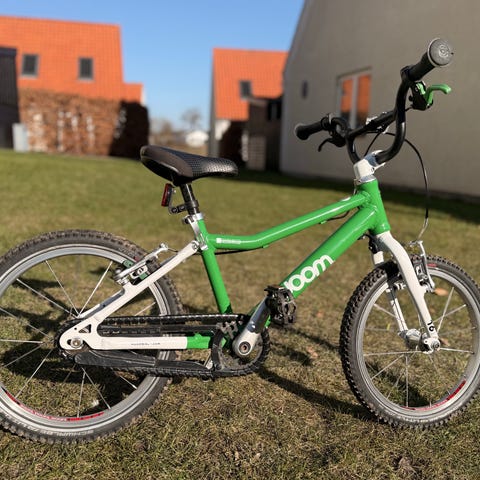 Woom 3 børnecykel med 16" hjul. Cyklen har let stel i grøn og hvid med lav indstigning, fodbremse bagtil og håndbremse foran. Udstyret med reflekser på hjulene og standard børnestyr. Sadlen er udskiftet til en Puky-saddel. Velegnet som cykel til børn, der passer til 16" hjulstørrelse.