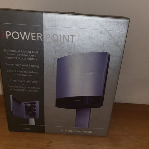 Power Point kabelskjuler til stikdåser. Enheden er designet som en boks, der kan monteres på væg eller stander, hvor stikdåser og opladere kan skjules bag en låge. Velegnet til at samle og skjule flere strømforsyninger og kabler samme sted for et mere ryddeligt udtryk i f.eks. stue eller kontor.