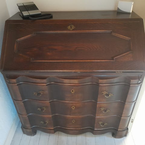 Charmerende ældre chatol med udtræksplade og mulighed for at lukke fronten sammen. Har synlige brugsspor, herunder hakker samt en manglende knop – se billeder. Fremstår med patina og sjæl, oplagt til istandsættelse, maling eller brug som det er.