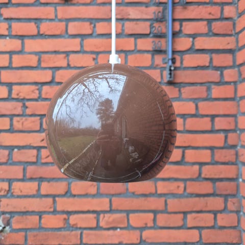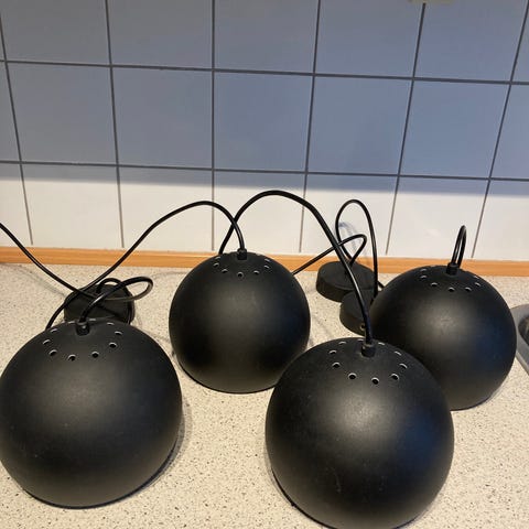 2 stk. nice kuglependel i mat sort med ophæng og pærer. Hvide inderskærme. Ø 17 cm H 14 cm. Lamperne har sorte stofledninger op til loftet på henholdsvis 57 cm og 74 cm. Fra ophæng er der 210 cm sort plast ledning. Samlet strømtilslutning. CE godkendt. Begge lamper virker fint og er hele og pæne.