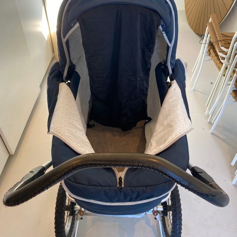 Odder barnevogn i sort med lys inderside. Vognen har klassisk stålstel med fire lufthjul og indkøbskurv under vognen. Justerbart håndtag og rummelig liggedel med madras fra Dunlopillo. Velegnet til daglige gåture og lur for spædbarn/barn.