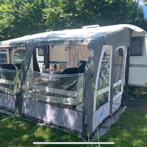 luftfortelt til campingvogn i grå/blå nuancer. Forteltet har store vinduespartier i front og sider samt tagvinduer, der giver godt lysindfald. Det fastgøres til campingvognen langs siden og forankres med barduner. Velegnet som ekstra opholdsrum eller opbevaringsplads ved campingvognen.