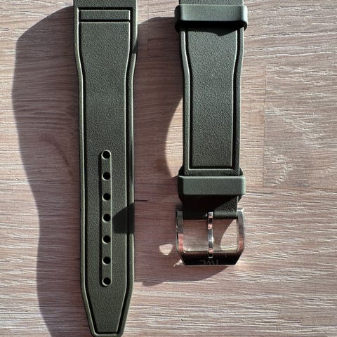 IWC urrem til ur. Remmen er udført i sort gummi med struktureret overflade på ydersiden og præget mønster på indersiden. Spændet er i metal med IWC-logo. Velegnet som erstatningsrem til kompatible IWC ure, hvor der ønskes en robust og vandafvisende gummirem i neutral sort farve.
