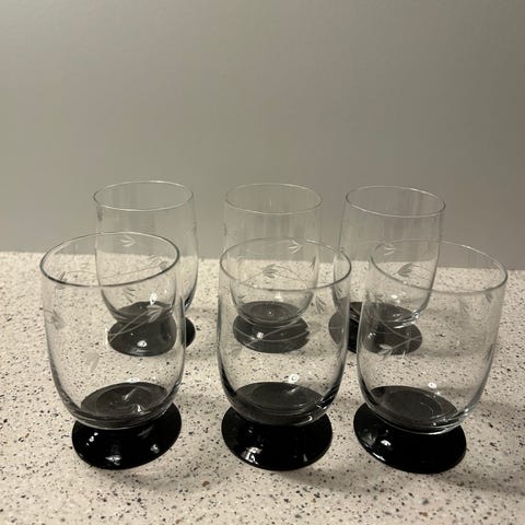 4 gamle ølglas, højde 10,5 cm og 2 små vandglas, h. 9 cm i serien “Ranke” fra Holmegaard. Kumme slebet med ranke, hvidt glas med sort fod. Meget fine og i fin stand uden ridser eller skår. Pris for alle glas: 140 kr. Sælges kun samlet. Sender gerne.