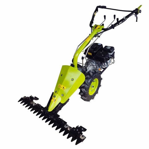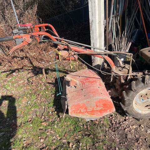 Brumi. Honda 5.0 OHV fræser med monteret fingerklipper. 86cm klippebredde. Den er lige blevet startet uden problemer efter en lang vinter. Benzinmotor med OHV-teknologi. Maskinen har håndtag med betjeningsgreb og trækhjul, samt frontmonteret fingerklipper til klipning eller slåning af græs og mindre bevoksning. Velegnet til have- og mindre landbrugsopgaver som jordbearbejdning og slåning af arealer.