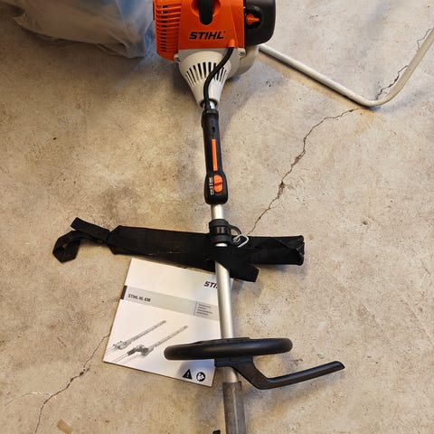 Stihl kombimaskine til havearbejde med flere udskiftelige redskaber. Sættet omfatter motorenhed med bæresele samt forskellige skafter og hoveder, herunder trimmerhoved, kædesav-/grensav-tilbehør og blæserdel.