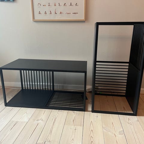 Beskrivelse : Den sorte hylde i pulverlakeret jern fra Muubs kan hænges op på væggen, men kan også bruges på gulvet. Brug den til vinglas og tallerkener i køkkenet eller til bøger og magasiner i stuen. Uanset hvor du placerer hylden, vil de rå materialer tilføre et stilrent udtryk til din indretning.