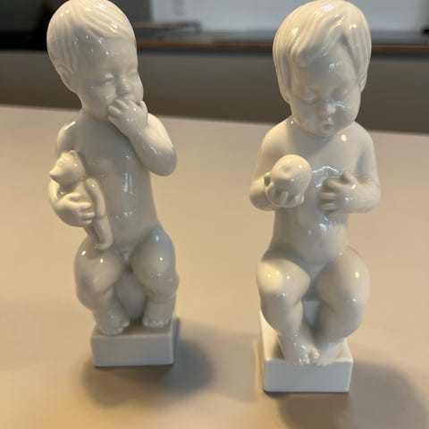 Fine og humoristiske figurer i klassisk hvid porcelæn fra Royal Copenhagen. Motiverne forestiller børn med henholdsvis hovedpine og tandpine (model nr. 2206 og 2207).