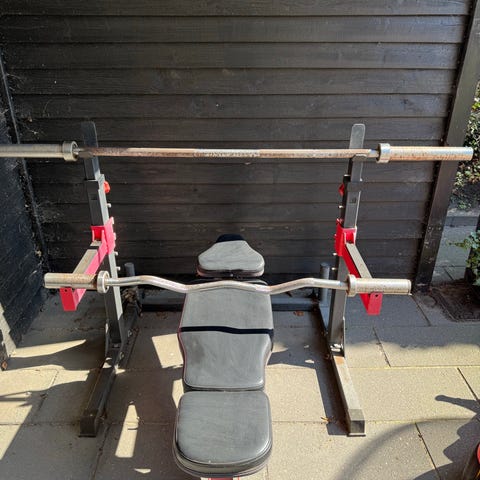 Træningsbænk med vægtstang, vægtskiver og gulvmåtter
