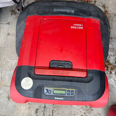 Robomow RC304 med tilhørende ladestation og strømkabel. Kommer med RoboGrip hjul monteret, ekstra kniv, ekstra batteri.