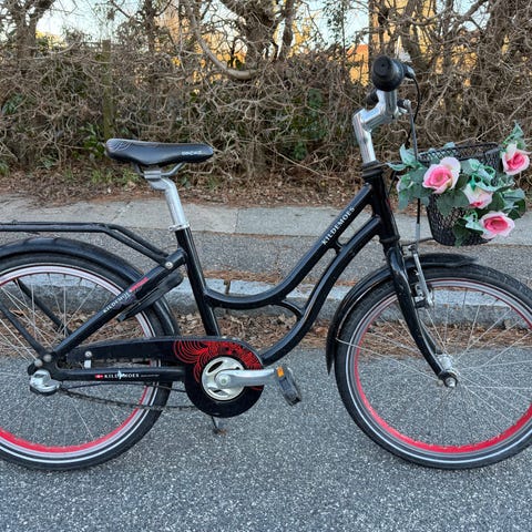 Kildemoes børnecykel med 24" hjul. Cyklen er i sort med røde detaljer og har bagagebærer, skærme og kædeskærm. Den er udstyret med lige styr og sadel i sort med hvide detaljer. Egnet til større børn, der passer en 24" cykel. Slitage og brugsspor fremgår af billederne, herunder styrene hvor der ses skade og nye greb skal monteres. Mangler lås
