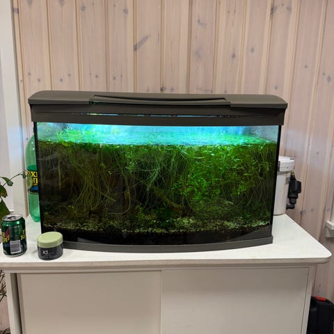 Akvarium i glas med hvid kant og låg. Akvariet er indrettet med sand bundlag og forskellige levende planter, posthornsnegle og nok ca 50 stk rejer i blandede farver.
