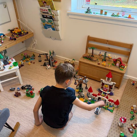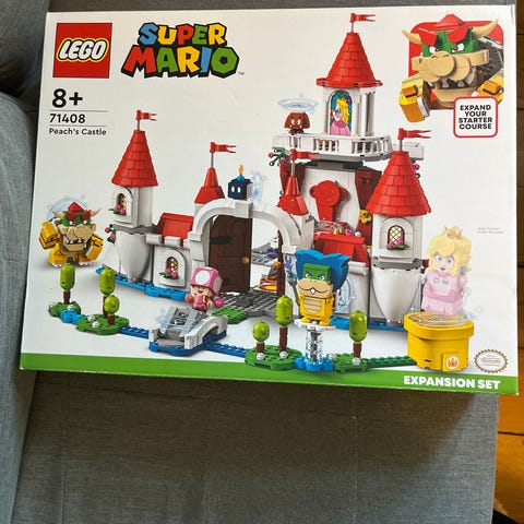Uåbnet LEGO Super Mario Peach’s Castle Expansion Set byggesæt. Sættet er et udvidelsessæt til LEGO Super Mario universet og forestiller Peachs slot med flere platforme og detaljerede elementer. Indeholder blandt andet slotstårne, gangbroer og forskellige figurer og elementer fra Super Mario spiluniverset. Sættet er egnet til leg og opbygning af baner sammen med andre LEGO Super Mario startsæt og udvidelsessæt.