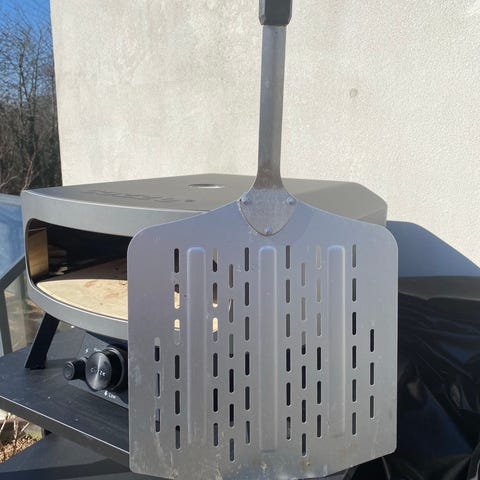 Morsø Forno Gas pizzaovn med integreret pizzasten. Gasdrevet bordmodel med låg og indbygget termometer på fronten. Ovnen har fastmonterede ben for stabil placering og tilsluttes gas via medfølgende gasslange og regulator, som ses på billedet. Pizzastenen er placeret i ovnen og viser brugsspor. Velegnet til udendørs madlavning og bagning af pizza og andre retter på sten.