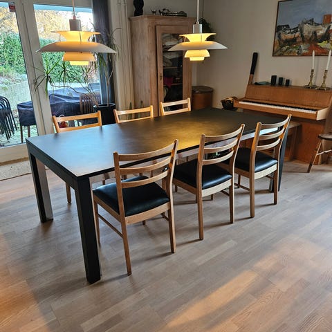 Bordet har været brugt men fremstår i ok stand. Der er rigtig god plads ved bordet og når pladerne er i, kan der være 7 på hver side.