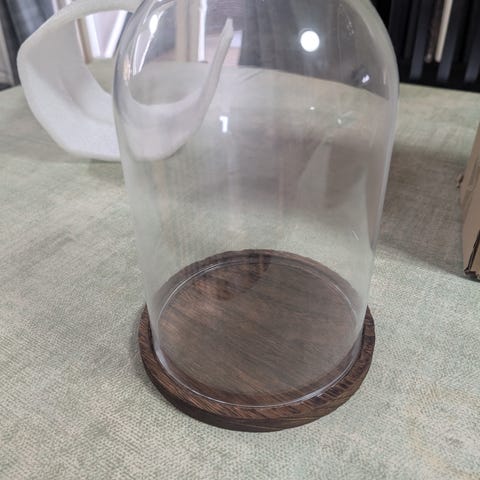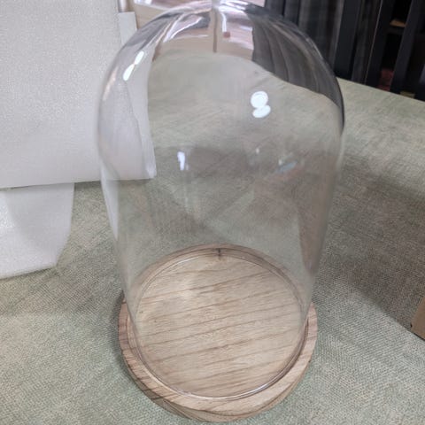 Nordic Nesting glaskuppel med træbund. 50 cm høj, 30 cm i diameter. Nypris 995 kr.