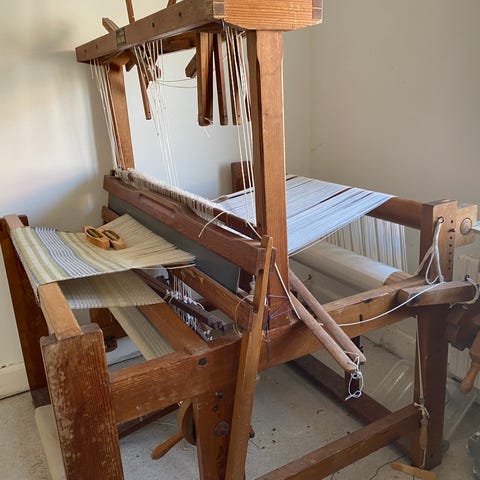 Vævestol i træ. Klassisk, stor gulvvævestol med træramme og tilhørende skafter, brædder og tilbehør som vist på billederne. Egnet til vævning af tekstiler i hjemmet eller værkstedet. Konstruktionen er i massivt træ med snoretræk og bomme til opspænding af trend og islæt.