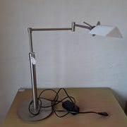 Skrivebordslampe i sort metal med justerbar arm og rund fod. Lampen har en skærm i kuppelform og tænd/sluk-funktion på foden. Velegnet som arbejds- eller læselampe på skrivebord eller natbord.