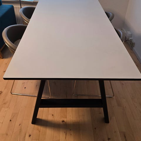 Bordet har en hvid højtrykslaminat-overflade med en flot sort kant, hvilket gør det ekstremt modstandsdygtigt over for ridser og pletter – det kan tåle alt fra børnetegninger til rødvin!