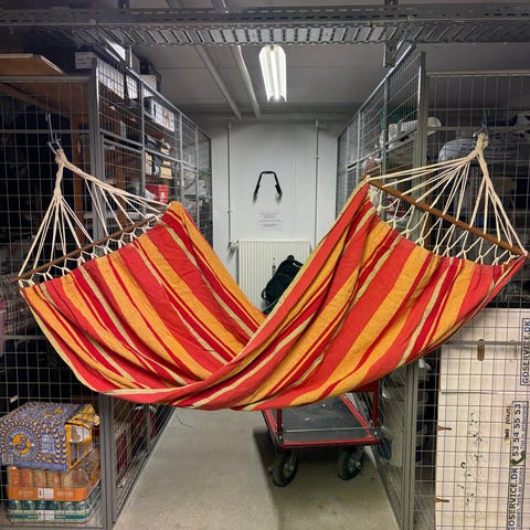 Hængekøje med stativ i grå- og hvidstribet stof. Hængekøjen er monteret på et fritstående stativ, som kan placeres på terrasse, altan eller i haven. Stoffet er udspændt mellem to tværpinde, hvilket giver en plan liggeflade. Egnet til afslapning udendørs for én person ad gangen, afhængigt af belastningsgrænsen for stativ og hængekøje. Velegnet til brug på fast underlag som fliser eller træterrasse.