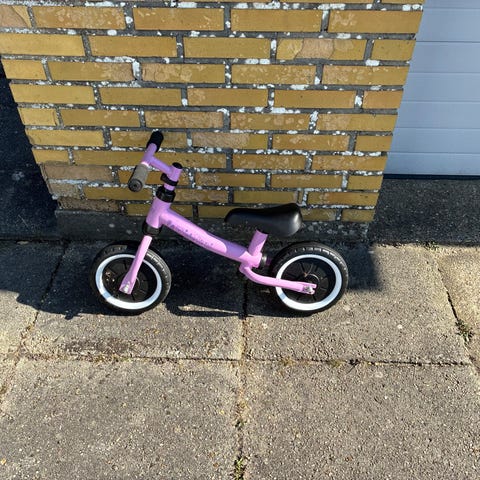 Stoy løbecykel med 10" hjul i grøn farve. Cyklen har hvidlige dæk og skærme, brun saddel og brune håndtag. Foran er der monteret en flettet kurv. Løbecyklen er egnet til mindre børn, der skal øve balance og motorik, før de skifter til almindelig cykel.