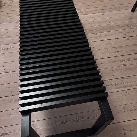 Skagerak bænk i sortmalet træ. Tydelige brugspor, men kan nemt dækkes med lidt tusch.