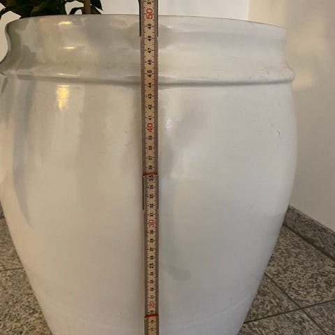 Stor grøn stueplante i hvid glaseret krukke.