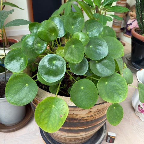 Planten står i jord i krukken, mål ses på foto.