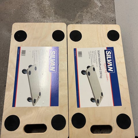 Møbelhund transportvogn i træ med fire hjul og bærehul i pladen. Velegnet til flytning og transport af tunge genstande som møbler og kasser. Den ene plade er mærket med maks. belastning 150 kg og den anden med maks. belastning 200 kg. Begge plader har runde skridsikre puder på oversiden for bedre stabilitet under transport.