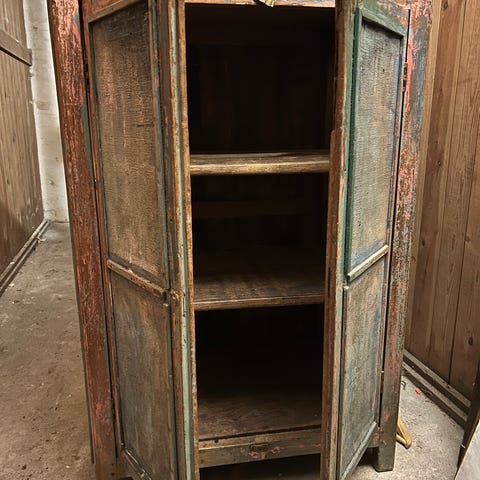 Fint gammelt møbel med dør og hylder, snedkereret af solidt hårdt træ. Formentlig fra Indonesien eller lignende. Købt for mange år siden, smukt patineret, og super fint hvis man er til den rustikke stil.
