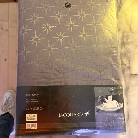 Bolia tekstil i hvid med diskret vævet mønster. Stoffet har et tone-i-tone mønster med felter og ornamenter, der giver en struktureret overflade. Velegnet til brug som dug, gardin eller andet boligtekstil, afhængigt af mål og behov. Materialet fremstår som et glat vævet tekstil med dekorative detaljer. Den er som ny på nær en lille plet som jeg tror den nok skal komme væk med lidt opvaskemiddel. Jeg ved ikke hvor dugen kommer fra.