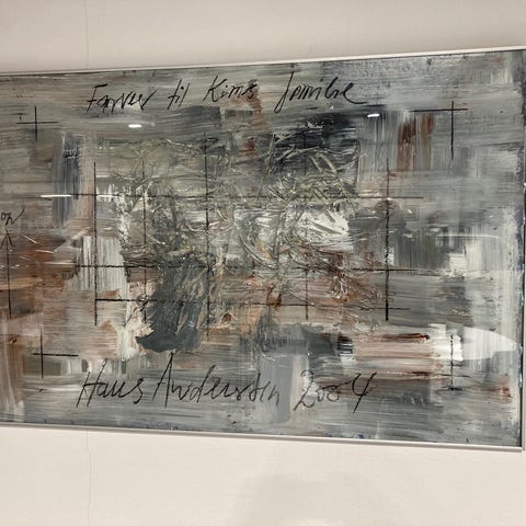 Anton Juul Pedersen maleri 20x30 cm med motiv af bryllup foran kirke “Pinsebryllup 1991”. Maleriet viser brudepar og gæster foran en kirke med rødt tag og grøn baggrund. Malet på lærred opspændt på træramme. På bagsiden er der mærkat med kunstnerens navn og adresse samt ophængswire monteret på rammen.