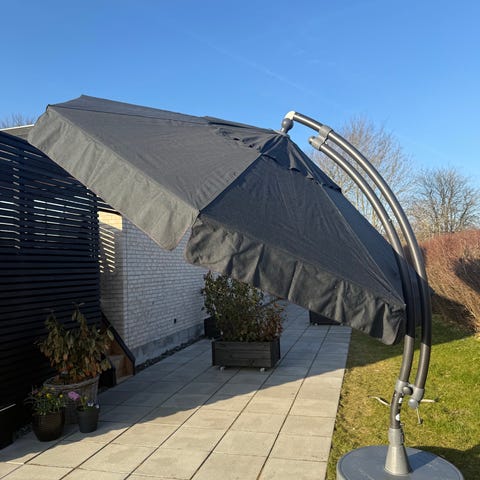 Pæn antricitgrå hængeparasol. Diameter 3,5 m. Brugt (2,5 år ) men fremstår som ny