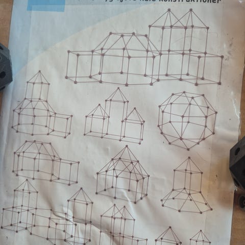 Man sætter stængerne ind i hullerne i kuglerne, og konstruere på den måde sin helt egen model, eller følger en af de forslag der er med i æsken.