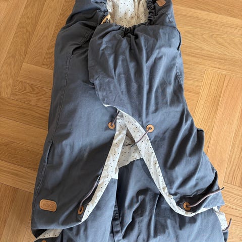 Voksi kørepose i grå. Sommer og vinterdyne og bræt medfølger. Fra 2017 men i god stand. Enkelte snore er slidte.