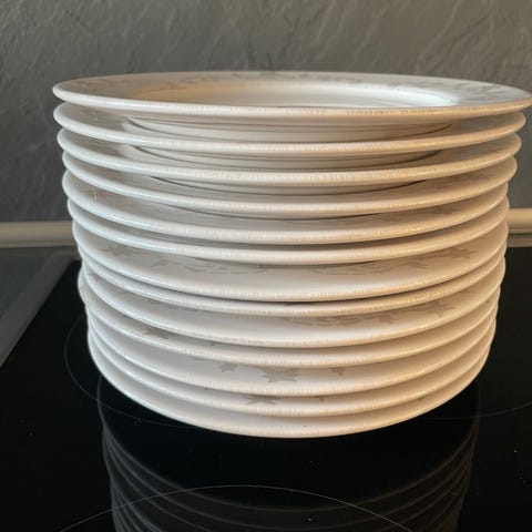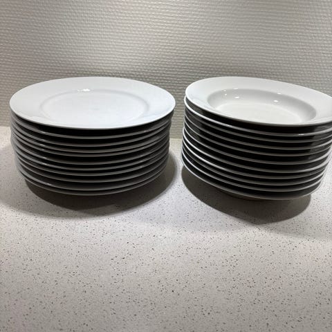 Home Art tallerkener i hvidt porcelæn med diskret mønster langs kanten. Klassiske middagstallerkener egnet til daglig brug eller borddækning ved særlige lejligheder. Tallerkenerne kan bruges til servering af hovedretter eller større anretninger.