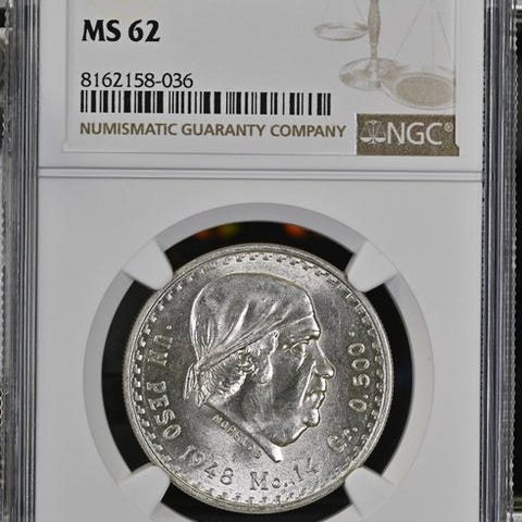 Lavet til vedhæng, og godt pudset osv. Men stadig en sølvpeso, så mon ikke der er nogen der synes den er pæn som den er, eller kan smeltes om til noget andet. Bemærk meget lavt sølvindhold, så den egner sig ikke som smykke med kontakt til huden (trods vedhænget).