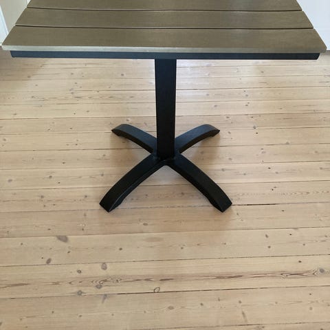 Kvadratisk havebord i grå trælameller med metalstel. Bordet har krydsfod i metal og en bordplade med længdegående lameller. Egnet til brug på terrasse, altan eller i haven som spise- eller cafébord.