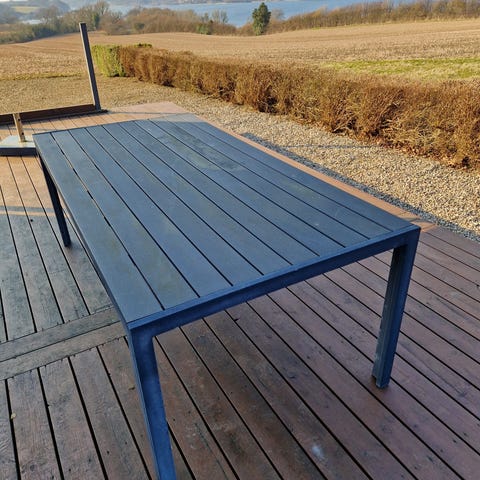 Rektangulært havebord med bordplade i sort lamel-design og stel i metal.