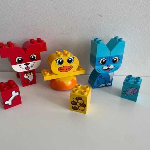 Puslespil for de helt små. Tiger, papegøje, ælling og panda. De kan skilles i mange dele og bygges om igen, evt. til fjollede dyr.