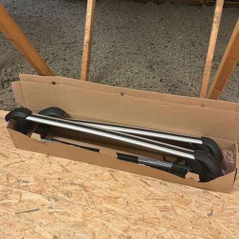 Tagboks med nøgle, tagbøjler og 5 campingstole. Gaspatron virker ikke, så jeg bruger en pind.